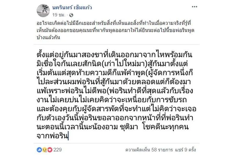 "อะไรจะเกิดต่อไปมีอีกเยอะสำหรับสิ่งที่เห็นและสิ่งที่ทำในเมื่อความจริงที่รู้ที่เห็นมันต้องออกขอบคุณนะที่พากันพูดออกมาให้ได้ยินนะต่อไปนี้ขอพ่อรินพูดบ้างแล้วกัน ตั้งแต่อยู่กันมาสองขาที่เดินออกมาจากไหพร้อมกัน มิเชื่อใจกันเลยสักนิด (เก่าไปใหม่มา) สู้กันมาตั้งแต่เริ่มต้น แต่สุดท้ายความดีก็พ่ายแพ้คำพูด ผู้จัดการหนึ่งก็ไปละส่วนผมพ่อรินที่สู้กันมาด้วยตลอด แต่ก็ต้องมาแพ้ เพราะพ่อรินไม่ดีพอ พ่อรินทำดีที่สุดแล้วกับเรื่องงาน ไม่เคยบ่นไม่เคยคิดว่าจะเหนื่อยกับการขับรถ และต้องคุยกับผู้จัดการสารพัดที่จะทำ แต่ไม่คิดว่าจะเจอกับตัวเอง วันนี้พ่อรินขอลาออกจากหน้าที่ที่พ่อรินทำนะ ตอนนี้เวลานี้นะน้องอาม ชุติมา โชคดีนะทุกคน จากพ่อริน"