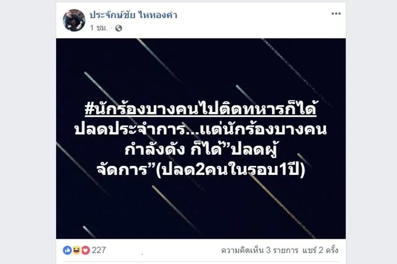 ล่าสุด "ประจักษ์ชัย ไหทองคำ" เจ้าของค่ายไหทองคำ เรคคอร์ด และเคยตกเป็นเรื่องร้อนกับอาม ชุติมา ในประเด็นลิขสิทธิ์เพลง ก็ได้โพสต์ข้อความผ่านทางเฟซบุ๊ก เมื่อช่วง 10.00 น. ที่ผ่านมา ระบุว่า "นักร้องบางคนไปติดทหารก็ได้ ปลดประจำการ...เเต่นักร้องบางคนกำลังดัง ก็ได้”ปลดผู้จัดการ”(ปลด2คนในรอบ1ปี)" ทั้งนี้ชาวเน็ตต่างเชื่อมโยงข้อความดังกล่าวว่าตั้งใจจะสื่อถึง อาม ชุติมา อดีตนักร้องในสังกัดของตนเองหรือไม่