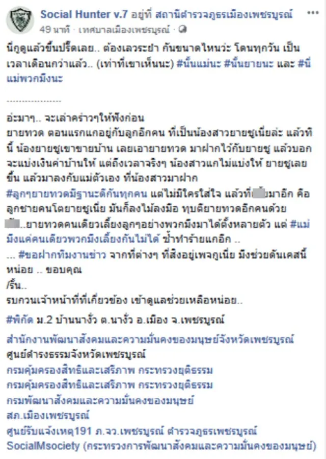 เป็นอีกหนึ่งเรื่องราวที่เรียกเสียงวิพากษ์วิจารณ์เป็นอย่างมาก เมื่อเพจ "Social Hunter v.7" ได้มีการโพสต์เรื่องราวของหญิงชราคนหนึ่ง ที่มักจะถูกทำร้ายร่างกายอยู่เป็นประจำ จนเพื่อนบ้านทนไม่ไหว โดยได้ระบุว่า