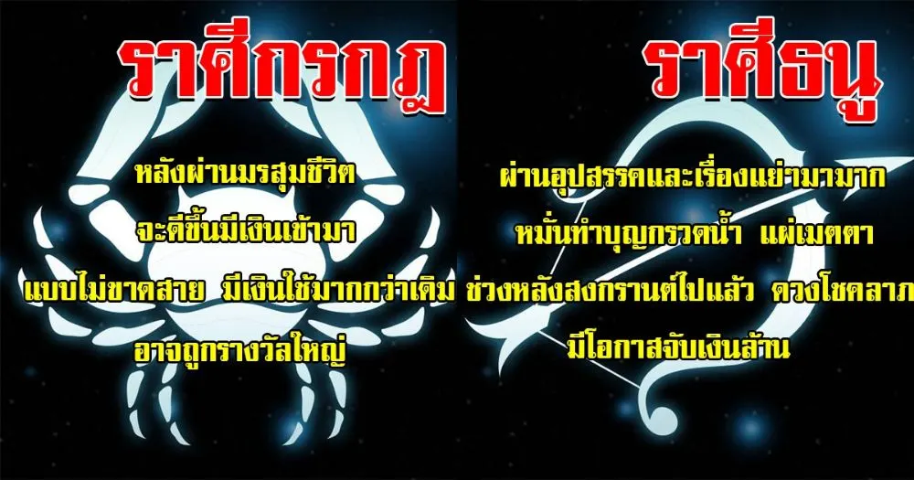 สำหรับราศีนี้เขาบอกว่าถึงคุณจะผ่านอะไรมาเรื่องราวต่างๆ แย่ขนาดไหน ก็ให้คุณเชื่อมั่นในความดีของตัวเอง เพราะความดีเนี่ยหละกำลังจะส่งผลให้เรื่องราวดีๆ เข้ามาหาตัวคุณ โดยเฉพาะเรื่องโชคลาภ มีเกณฑ์จะถูกหวยเงินล้านเลยก็ว่าได้ ดังนั้นจงเชื่อมั่นตัวเองทำบุญต่อไป หรือช่วงไหนที่คิดว่าอารมร์ดีๆ ปลอดโปร่ง ลองเสี่ยงโชคกันสักใบ ไม่แน่นะคุณอาจกลายเป็นเศรษฐีแบบไม่ทันตั้งตัวรับสงกรานต์เลยก็ว่าได้