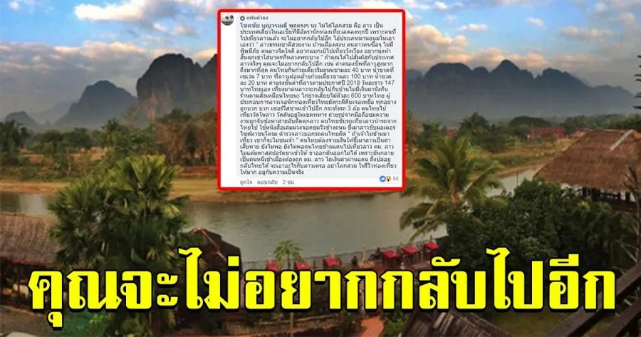 ล่าสุด ชาวเน็ตได้ทราบข่าวของหนุ่มไทยที่ถูกแชร์ไปอย่างมากในโซเชียล ได้ออกมาเผยเรื่องราวประสบการที่เคยไปเที่ยวประเทศลาว เขาได้เล่าเรื่องทั้งหมดที่เคยเจอมา พร้อมระบุข้อความว่า”พูดตรงๆ นะ ไม่ได้โลกสวย คือ ลาว เป็นประเทศเดียวในเอเชียที่มีอัตรานักท่องเที่ยวลดลงทุกปี เพราะคนที่ไปเที่ยวลาวแล้ว จะไม่อยากกลับไปอีก ไอ้ประเภทมานอนมโนเอาเองว่า