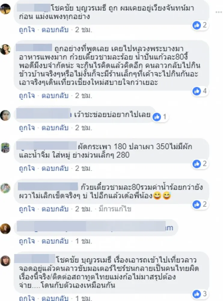 ที่ลาวเฝอคล้ายก๋วยเตี๋ยวชามละ 100 บาท น้ำขวดละ 20 บาท ค่าแรงขั้นต่ำที่ลาวตามประกาศปี 2018 วันละราว 147 บาทไทยเอง เที่ยงมาคนลาวจะกลับไปกินบ้านไม่มีเงินมานั่งกินร้านตามสั่งเหมือนไทยนะ ไก่ย่างเสียบไม้ตัวละ 600 บาทไทย ผู้ประกอบการลาวเจอนักท่องเที่ยวไทยยังกะผีดิบเจอเหยื่อ ทุกอย่างถูกบวก บวก เซอร์วิสชาตเข้าไปอีก กระทั่งรถ 3 ล้อ คนไทยไปเที่ยววัดในลาว วัดดันอยู่ในเขตทหาร ถ่ายรูปจากมือถือชมความงามถูกจับข้อหาสายลับติดคุกลาว