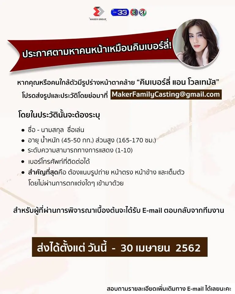 โดยเป็นการประกาศตามหาสุภาพสตรี ที่มีใบหน้าคล้ายกับนางเอกของเรื่อง อย่าง คิมเบอร์ลี่ ใครคิดว่าเหมือน! ใครคิดว่าใช่! ไม่ว่าจะเป็นคุณ หรือคนใกล้ตัว หากมีคุณสมบัติที่ตรงตามรายละเอียดด้านล่าง บอกเลยเป็นโอกาสทองของคุณแล้ว