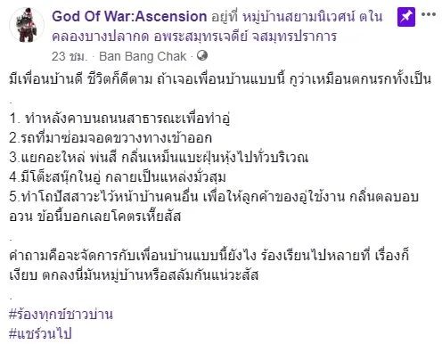 เมื่อวันที่ 7 เม.ย. 62 ที่ผ่านมา ได้มีเพจสาธารณะชื่อ God Of War:Ascension ได้โพสต์ข้อความ และภาพที่เรียกได้ว่าสุดจะรับไม่ได้กับผู้ที่พบเห็น โดยเหตุการณ์นี้เกิดขึ้นที่ หมู่บ้านสยามนิเวศน์ จ.สมุทรปราการ