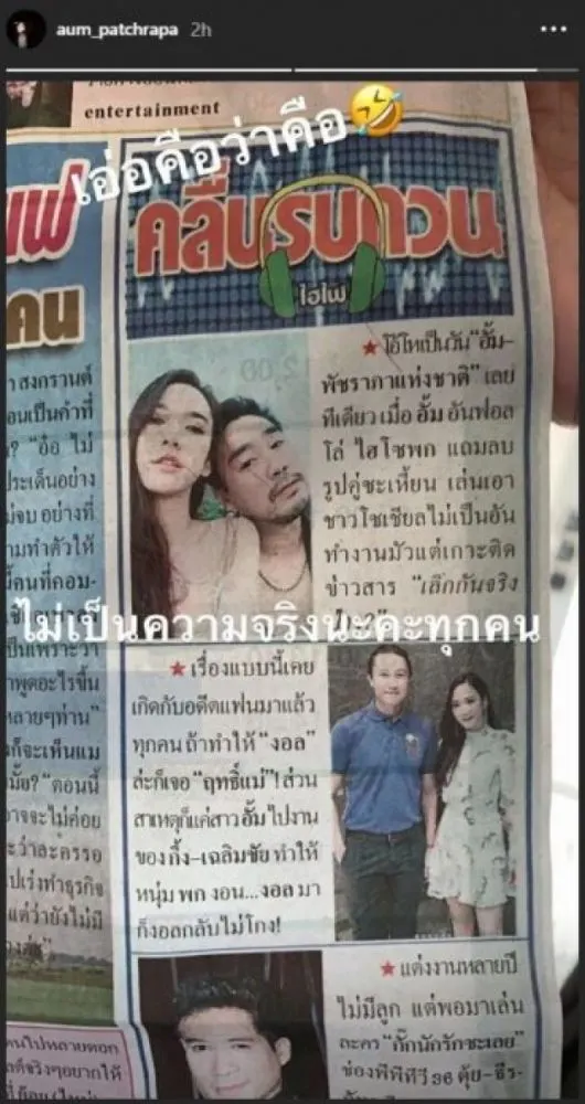 ล่าสุด ซุปตาร์สาว อั้ม พัชราภา ได้ออกมาพูดแล้วจ้า เป็นครั้งแรก ผ่านทางไอจีสตอรี โดย อั้ม ได้โพสต์รูปข่าวจากหนังสือพิมพ์ ที่เขียนว่า อั้ม อันฟอลโล่ ไฮโซพก แถมลบรูปคู่ซะเหี้ยน เล่นเอาขาวโซเชียลไม่เป็นอันทำงานมัวแต่เกาะติดข่าวสาร เลิกกันจริงป่าว? เรื่องแบบนี้เคยเกิดกับอดีตแฟนมาแล้วทุกคน ถ้าทำให้ งอล ล่ะก็เจอ ฤทธิ์แม่! ส่วนสาเหตุก็แค่สาวอั้มไปงานของ กึ้ง เฉลิมชัย ทำให้หนุ่ม พก งอน งอลมาก็งอลกลับไม่โกง โดยนางเอกสาว ได้โพสต์สั้นๆ ว่า ไม่เป็นความจริงนะคะทุกคน