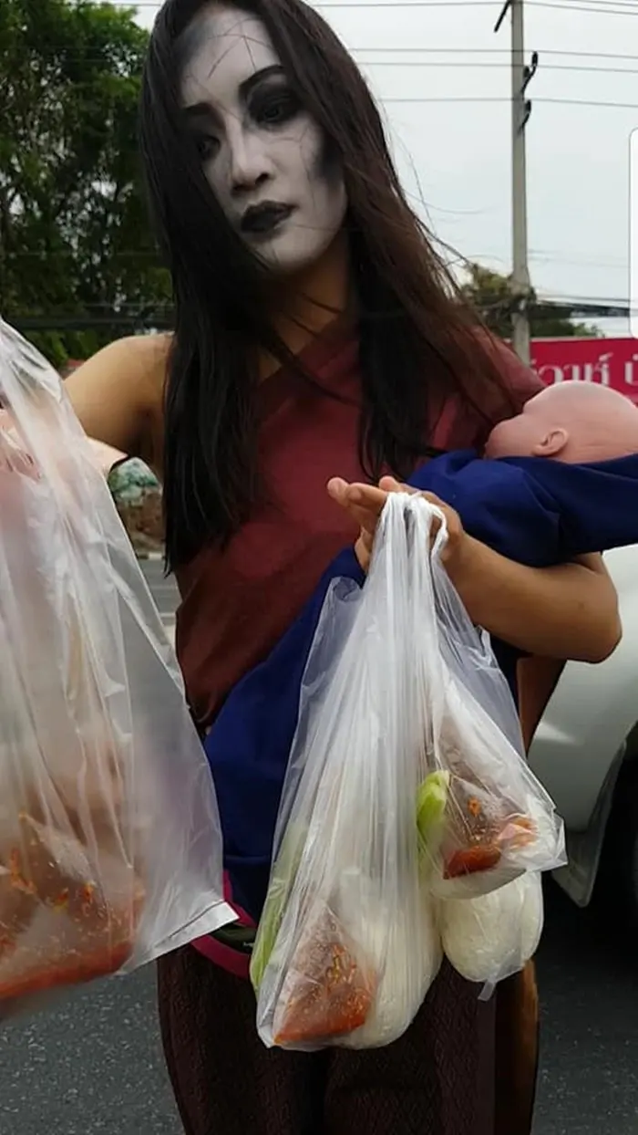 ทำเอาผู้คนที่สัญจรผ่านไปผ่านมาบริเวณสี่แยกวัดพระญาติ อ.พระนครศรีอยุธยา จ.พระนครศรีอยุธยา พากันตกใจและฮือฮา เมื่อมีหญิงสาวแต่งชุดแม่นาคพระขโนง อุ้มตุ๊กตาเป็นลูก มาเดินขายหมูปิ้งชุดละ 25 บาท หลายคนพากันอุดหนุนและถ่ายภาพ-คลิปวิดีโอมาแชร์โซเชียลจนกลายเป็นกระแส