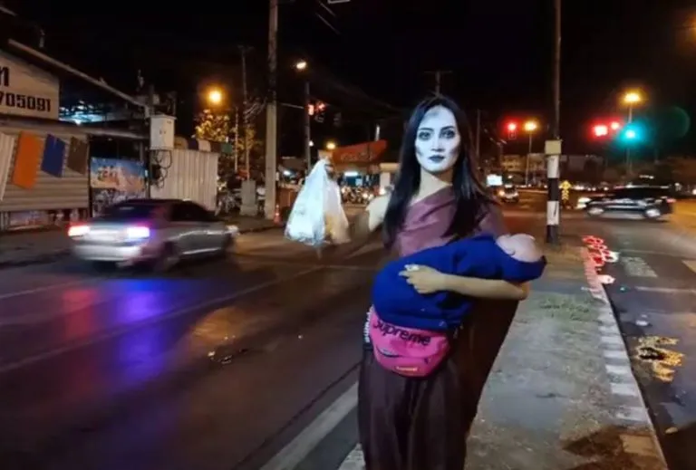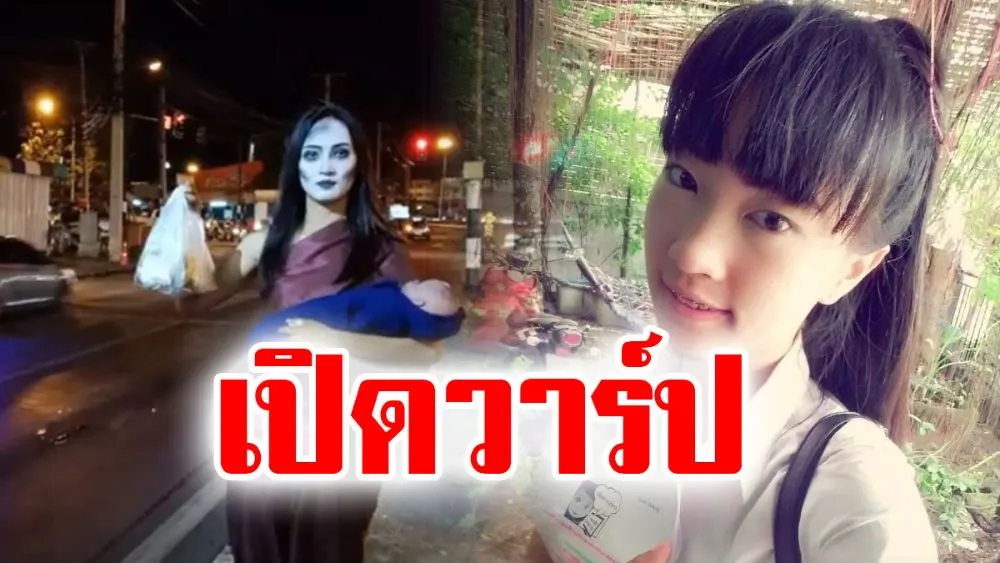 เปิดวาร์ป สาวน้อยที่แต่งเป็นแม่นาคขายหมูปิ้งกลางสี่แยกไฟแดง