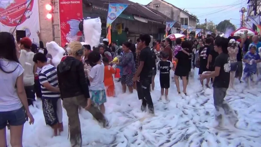 ถนนข้าวปุ้น เทศบาลเมืองนครพนม เลียบถนนริมฝั่งแม่น้ำโขง ประชาชน และนักท่องเที่ยวมากมาย เล่นน้ำกันอย่างสนุกสนาน สืบสานประเพณีไทยด้วยการแต่งกายย้อนยุค การสรงน้ำพระ ตลาดโบราณ การละเล่นย้อนยุค อาหารพื้นเมือง ปาร์ตี้โฟม ฯลฯ ที่ขาดไม่ได้ก็ต้อไปงชิมขนมจีน หรือข้าวปุ้น ให้สมกับเป็นชื่อถนนของที่นี่โดยให้นักท่องเที่ยว และประชาชน ได้ชิมกันแบบฟรีๆ มีการแสดงต่างๆ