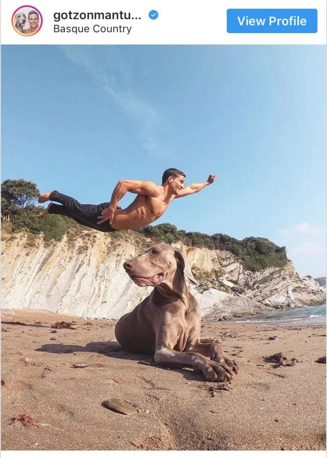 เขาทำท่าบินอยู่เหนือน้องหมาพอดี น่าเอ็นดูจริงๆ ร่างกายต้องแข็งแกร่งจริงๆด้วย
