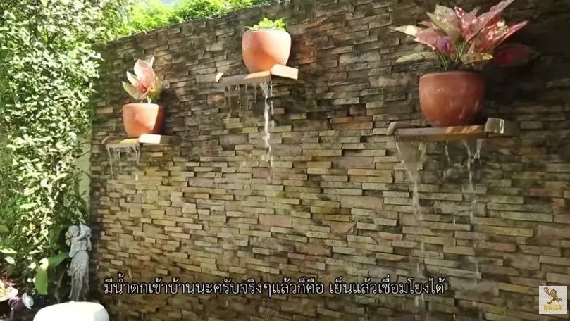 5.น้ำพุ และน้ำตก ถัดจากรั้วบ้านเป็นบริเวณสวนนอกบ้านที่ร่มรื่น ซึ่งก็มีน้ำพุ และน้ำตกประดับไว้ ซึ่งตามความเชื่อในด้านฮวงจุ้ยแล้วไม่ว่าจะเป็นน้ำพุ หรือน้ำตกก็ตาม ล้วนเป็นสิ่งที่สร้างพลังที่ดีให้กับบ้าน อย่างน้ำตกนั้นถ้าติดตั้งอย่างถูกต้องควรให้น้ำตกไหลเข้าสู่ตัวบ้าน ไม่ใช่ไหลออกนอกตัวบ้าน