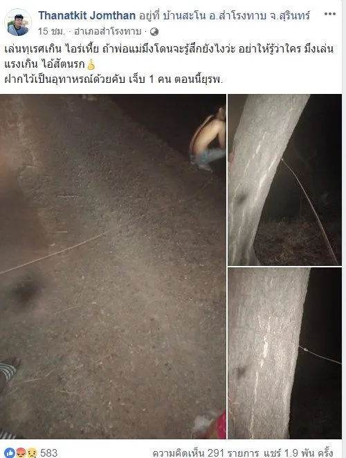วันที่ 9เม.ย.62 เป็นอีกหนึ่งเรื่องราวที่ถูกแชร์บนโลกออนไลน์จำนวนมาก หลังผู้ใช้เฟซบุ๊กชื่อ Thanatkit Jomthan โพสต์ภาพและบอกเล่าเหตุการณ์ บริเวณบนถนน บ้านสะโน อ.สำโรงทาบ จ.สุรินทร์ ซึ่งพบว่ามีคนนำเส้นเลวดขนาดยาวมามัดกับต้นไม้ และขึงขวางถนนในยามค่ำคืน ส่งผลให้ผู้ที่ขี่รถจักรยานยนต์ผ่านเส้นทางดังกล่าว ได้รับบาดเจ็บ 1 ราย