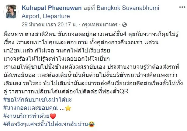 ผู้โพสต์ระบุข้อความว่า คือนทท.ต่างชาติ2คน ขับรถจอดอยู่กลางเลนส์ชั้น4 คุยกับจราจรก็คุยไม่รู้เรื่อง เราเลยเขาไปคุยเเละสอบถาม ทั้งคู่ต้องการคืนรถเช่า เเต่วนมา2ชม.เเล้ว ก้ไม่เจอ จนตกไฟล์ไปเรียบร้อย นางจะร้องไห้ไม่รู้จะทำไงเลยบอกให้ใจเย็นๆ