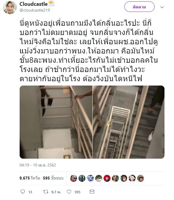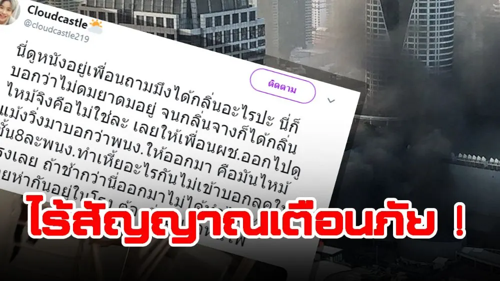 นี่ดูหนังอยู่เพื่อนถามมึงได้กลิ่นอะไรปะ นี่ก็บอกว่าไม่ดมยาดมอยู่ จนกลิ่นจางก็ได้กลิ่นไหม้จิงคือไม่ใช่ละ เลยให้เพื่อนผช.ออกไปดู แม้งวิ่งมาบอกว่าพนง.ให้ออกมา คือมันไหม้ชั้น8ละพนง.ทำเ...้ยอะไรกันไม่เข้าบอกลคในโรงเลย ถ้าช้ากว่านี่ออกมาไม่ได้ทำไงวะ ตายห่ากันอยู่ในโรง ต้องวิ่งบันไดหนีไฟ pic.twitter.com/Hoj7ED625e