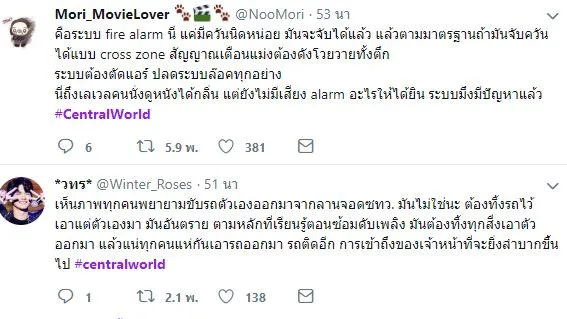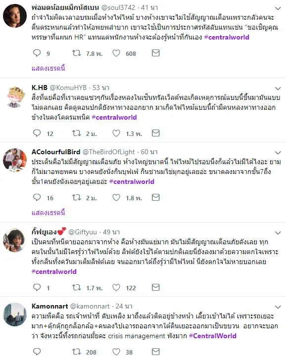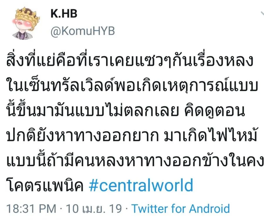 มึงได้ยินเสียงกรี๊ดแบบดังมากกกกกกก ไม่รู้ออกกันได้หมดยังแต่พนักงานเป็นลมเต็มเลย รถก็ยังเอาออกมาไม่ได้อะ คนวิ่งกันเต็มถนนเลย แต่มีรถดับเพลิงมาแล้วๆๆๆๆ ฮือออออออ #ไฟไหม้เซนทรัลเวิล์ด pic.twitter.com/sGm0tPWMzq