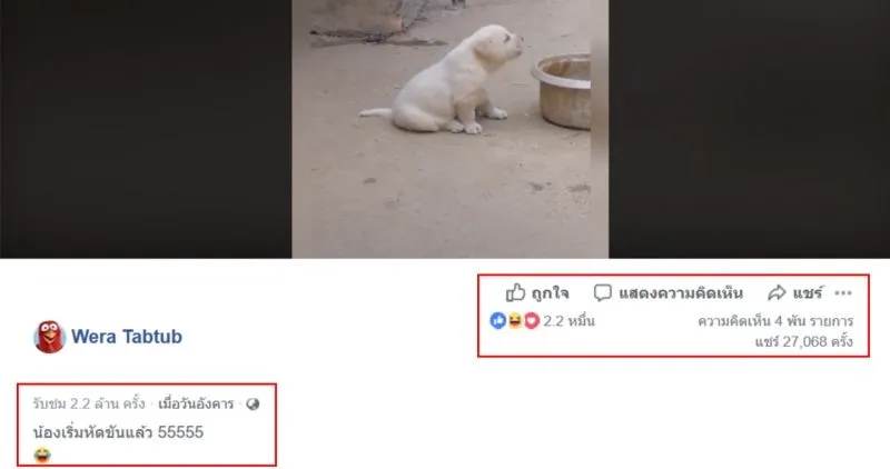 เป็นคลิปที่น่ารักๆที่ดูเหมือนจะธรรมดาแต่มีผู้เข้าชมมากกว่า 2 ล้านครั้งในเวลาเพียงไม่กี่วัน เมื่อวันที่ 9 ที่ผ่านมาทางเพจ Wera Tabtub ได้แชร์คลิปของน้องหมา ตัวหนึ่งที่ถูกเลี้ยงรวมไว้กับไก่ แต่พอเมื่อมีเสียงไก่ขันดังขึ้นเจ้าหมาน้อย ก็ร้องตามแบบเป๊ะๆ จนสร้างรอยยิ้มและเสียงฮาให้กับชาวเน็ตเป็นอย่างมาก