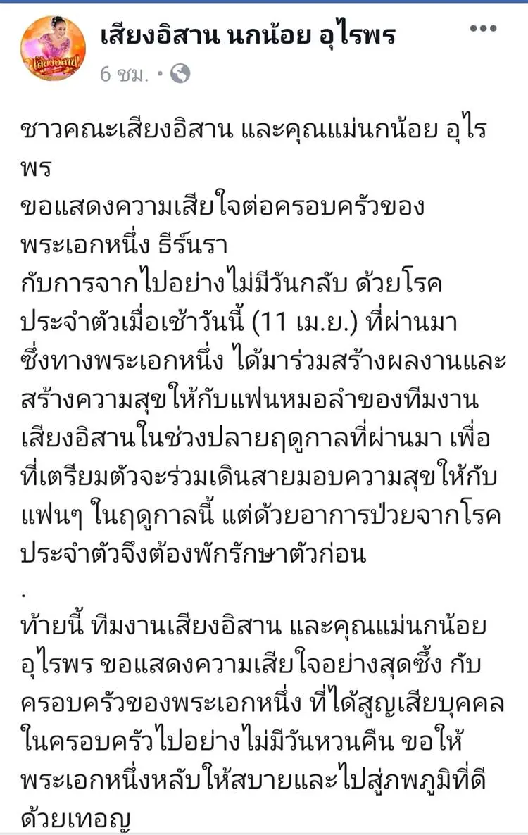 ย้อนโพสลางบอกเหตุ พระเอกหมอลำชื่อดัง ก่อนเสียชีวิตกระทันหัน