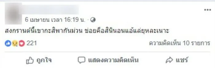 เกี่ยวกับเรื่องนี้ เมื่อย้อนโพสต์ของ หนึ่ง ธีร์นรา ได้โพสต์เมื่อวันที่ 6 เมษายน 2562 ในทำนองตัดพ้อว่า "สงกรานต์นี้เขากะสิพากันม่วน ข่อยคือสินินอนแอ้แล่ยุหละเนาะ" (แปลว่า....สงกรานต์นี้ คนอื่นคงพากันไปสนุก ส่วนผมคงนอนแผ่อยู่นี่แหละเนอะ)