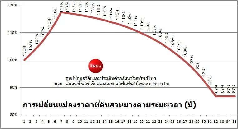 3. ราคาสวนยางที่มียางอายุ 8-32 ปี ราคาก็จะลดหลั่นลงตามลำดับ จาก 117% เป็น 87% หรือลดลงประมาณ 30% ของราคาสูงสุดในปีที่ 7