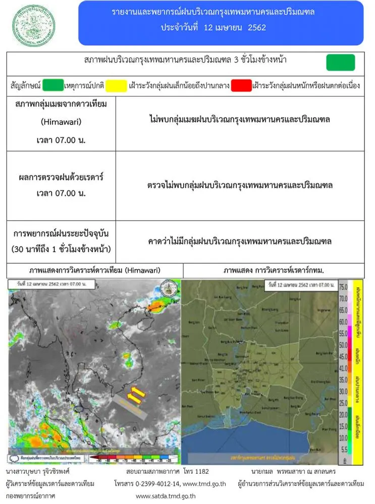 วันที่ 12 เม.ย.62 พยากรณ์อากาศ 24 ชั่วโมงข้างหน้า ประเทศไทยตอนบนมีอากาศร้อนโดยทั่วไปกับมีอากาศร้อนจัดบริเวณภาคเหนือ ภาคตะวันออกเฉียงเหนือ และภาคกลาง โดยมีฝนฟ้าคะนองบางแห่งในภาคเหนือตอนล่าง ภาคตะวันออกเฉียงเหนือ ภาคตะวันออก ภาคกลาง และภาคใต้ ขอให้ประชาชนบริเวณประเทศไทยตอนบนดูแลสุขภาพเนื่องจากสภาพอากาศร้อนในระยะนี้ไว้ด้วย อนึ่งในช่วงวันที่ 13 – 16 เม.ย. 62 บริเวณความกดอากาศสูงจากประเทศจีนจะแผ่ลงมาปกคลุมภาคตะวันออกเฉียงเหนือและทะเลจีนใต้ ในขณะที่บริเวณประเทศไทยตอนบนมีอากาศร้อน ทำให้บริเวณภาคเหนือตอนล่าง ภาคตะวันออกเฉียงเหนือ ภาคกลาง และภาคตะวันออก มีพายุฤดูร้อนเกิดขึ้นโดยมีลักษณะของพายุฝนฟ้าคะนอง ลมกระโชกแรง และลูกเห็บตกบางพื้นที่