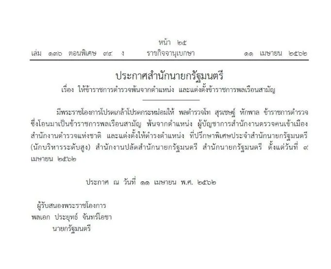 มีพระราชโองการโปรดเกล้าโปรดกระหม่อมให้ พลตำรวจโท สุรเชษฐ์ หักพาล ข้าราชการตำรวจซึ่งโอนมาเป็นข้าราชการพลเรือนสามัญ พ้นจากตำแหน่งผู้บัญชาการสำนักงานตรวจคนเข้าเมือง สำนักงานตำรวจแห่งชาติ และแต่งตั้งให้ดำรงตำแหน่ง ที่ปรึกษาพิเศษประจำสำนักนายกรัฐมนตรี (นักบริหารระดับสูง) สำนักงานปลัดสำนักนายกรัฐมนตรี สำนักนายกรัฐมนตรี ตั้งแต่วันที่ 9 เมษายน 2562