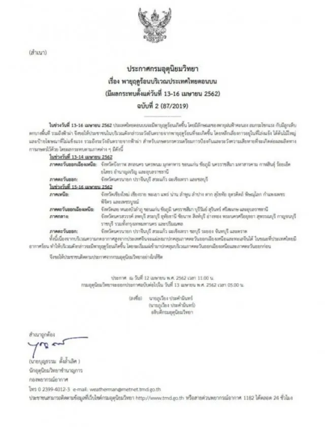 กรมอุตุฯ ประกาศเตือนพายุฤดูร้อนบริเวณประเทศไทยตอนบน (มีผลกระทบตั้งแต่วันที่ 13-16 เม.ย.2562) ฉบับที่ 2 ลงวันที่ 12 เม.ย.ระบุว่า ในช่วงวันที่ 13-16 เม.ย. ประเทศไทยตอนบนจะมีพายุฤดูร้อนเกิดขึ้น โดยมีลักษณะของพายุฝนฟ้าคะนอง ลมกระโชกแรง กับมีลูกเห็บตกบางพื้นที่ รวมถึงฟ้าผ่า จึงขอให้ประชาชนในบริเวณดังกล่าวระวังอันตรายจากพายุฤดูร้อนที่จะเกิดขึ้น โดยหลีกเลี่ยงการอยู่ในที่โล่งแจ้ง ใต้ต้นไม้ใหญ่ และป้ายโฆษณาที่ไม่แข็งแรง รวมถึงระวังอันตรายจากฟ้าผ่า สำหรับเกษตรกรควรเตรียมการป้องกันและระวังความเสียหายที่จะเกิดต่อผลผลิตทางการเกษตรไว้ด้วย โดยผลกระทบตามภาคต่าง ๆ มีดังนี้