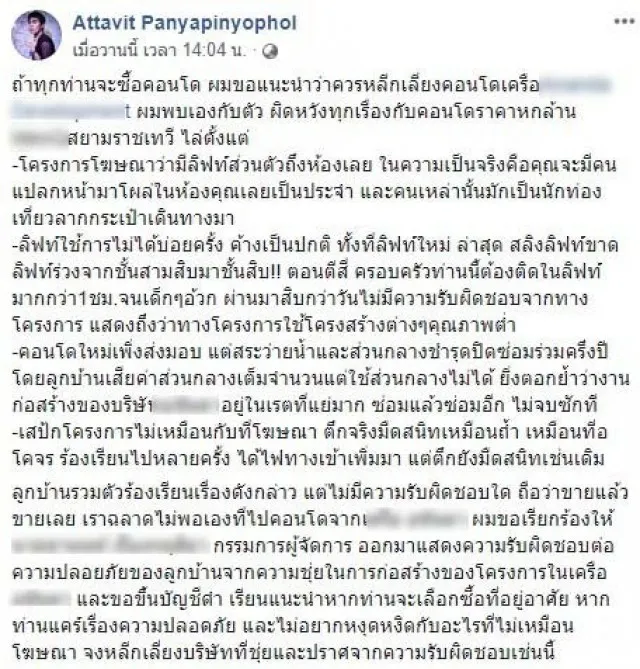 โดยผู้ใช้เฟซบุ๊กชื่อ Attavit Panyapinyophol ได้โพสต์คลิปความยาว 30 วินาที พร้อมระบุข้อความว่า ถ้าทุกท่านจะซื้อคอนโด ผมขอแนะนำว่าควรหลีกเลี่ยงคอนโดของบริษัทแห่งหนึ่ง ผมพบเองกับตัว ผิดหวังทุกเรื่องกับคอนโดราคา 6 ล้าน ใจกลางกรุงไล่ตั้งแต่โครงการโฆษณาว่ามีลิฟต์ส่วนตัวถึงห้องเลย