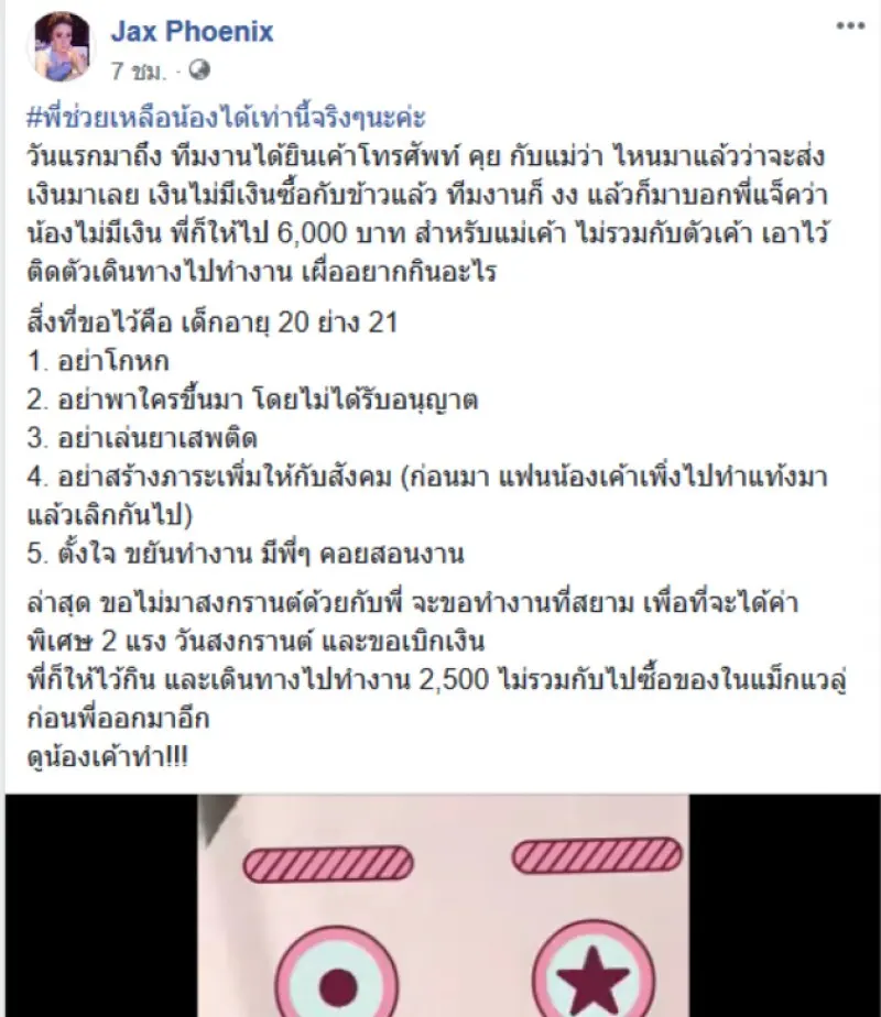 วันที่ 14 เมษายน 2562 ผู้สื่อข่าวรายงานว่า โลกออนไลน์มีการแชร์เรื่องราวของผู้ใช้เฟซบุ๊กชื่อ Jax Phoenix โดยระบุข้อความว่า #พี่ช่วยเหลือน้องได้เท่านี้จริงๆนะคะ วันแรกมาถึงทีมงานได้ยินเค้าโทรศัพท์คุยกับแม่ว่า ไหนมาแล้วว่าจะส่งเงินมาเลย เงินไม่มีเงินซื้อกับข้าวแล้ว ทีมงานก็งงแล้วก็มาบอกพี่แจ็คว่าน้องไม่มีเงิน พี่ก็ให้ไป 6,000 บาท สำหรับแม่เค้า ไม่รวมกับตัวเค้า เอาไว้ติดตัวเดินทางไปทำงานเผื่ออยากกินอะไร