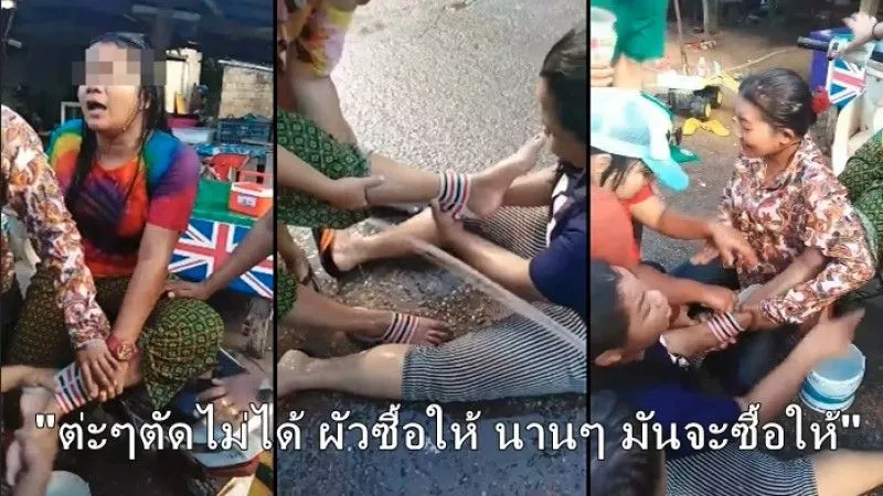ก่อนบอกด้วยน้ำเสียงเขินอาย และเสียดายหนักมาก ว่า "ต่ะๆตัดไม่ได้ ผัวซื้อให้ นานๆ มันซื้อให้ที" ทำทุกคนต่างหัวเราะลั่น หลังรู้เหตุผลของเพื่อนที่ไม่ยอมให้ตัดรองเท้า พร้อมกับพยายามช่วยกันออกแรงดึงรองเท้าเจ้าปัญหาอีกครั้ง ตามภาพเหตุการณ์ในคลิปวีดีโอต่อไปนี้