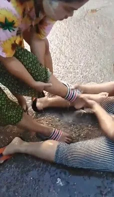 ด้านเพื่อนสาวต่างพากันเข้าช่วยออกแรงทั้งดึง ทั้งง้าง พร้อมแหลงใต้เจี๊ยวจ๊าว ชุลมุนกันอยู่พักใหญ่ แต่ก็ไม่เป็นผล ตัดสินใจจะขอนำมีดมาตัด บอกเพื่อนไม่ต้องเสียดายรองเท้า เดี๋ยวซื้อคู่ใหม่ให้ แต่ทันใดนั้น หญิงสาวเจ้าของรองเท้าก็ดึงเท้าตัวเองกลับขึ้นมาทันที