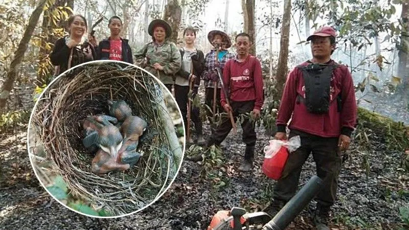 เจ้าหน้าที่ระดมกำลังทำแนวกันไป และดับไฟป่า ที่กำลังลุกลามอย่างรวดเร็ว ขณะกำลังดับไฟ เจ้าหน้าที่ได้ยินเสียงลูกน้อง ส่งเสียงดังมาจากต้นไม้ ที่ด้านล่างลำต้นมีไฟลุกลาม มีควันไฟคละคลุ้ง เจ้าหน้าที่ช่วยดับไฟใต้ต้นไม้ที่มีลูกนกส่งเสียงดัง โดนความร้อนจากเปลวไฟ เจ้าหน้าที่ได้ปีนขึ้นไปบนต้นมา สามารถนำลูกนกจำนวน 3ตัว ลงมาจากต้นไม้ และนำลูกนกไปไว้ในที่ปลอดภัย ผลของการดับไฟป่าเจ้าหน้าที่ใช้เวลา 15 นาที สามารถควบคุมเพลิงไฟป่าไว้ได้