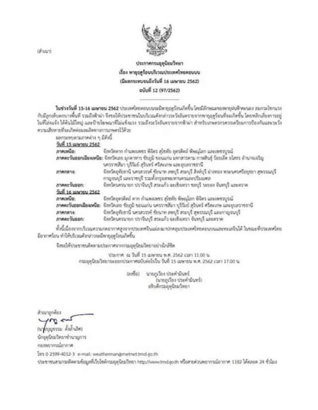 วันที่ 15 เมษายน 2562 นายภูเวียง ประคำมินทร์ อธิบดีกรมอุตุนิยมวิทยา ออกประกาศกรมอุตุฯ "พายุฤดูร้อนบริเวณประเทศไทยตอนบน (มีผลกระทบจนถึงวันที่ 16 เมษายน 2562)" ฉบับที่ 12 ลงวันที่ 15 เมษายน 2562 โดยระบุว่า ในช่วงวันที่ 15-16 เมษายน 2562 ประเทศไทยตอนบนจะมีพายุฤดูร้อนเกิดขึ้น โดยมีลักษณะของพายุฝนฟ้าคะนอง ลมกระโชกแรง กับมีลูกเห็บตกบางพื้นที่ รวมถึงฟ้าผ่าด้วย