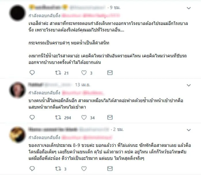 ด้านทวิตเตอร์คุณ ounhun นำภาพเสื้อและกางที่เปียกและเปื้อนสีแดงเป็นจุดๆ โพสต์ลงโซเชียลพร้อมข้อความระบุว่า "ขอเล่าหน่อยคือโมโหมากนี่จะไปรดน้ำตายายกับลุงป้าน้าอาอ่ะ แล้วคือข้างหน้าคนนั่งเต็มแล้วเลยมานั่งหลังกระบะกะพี่คิดว่าเปียกก็ไม่เป็นไรอ่ะ แต่สิ่งที่ได้คือเด็กแถวบ้านแม่งสาดน้ำสีใส่ สภาพคือแบบจะซักออกมั้ยแดงเถือกมากอิเxย"