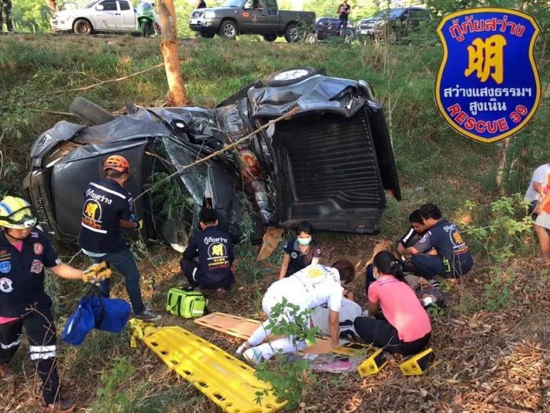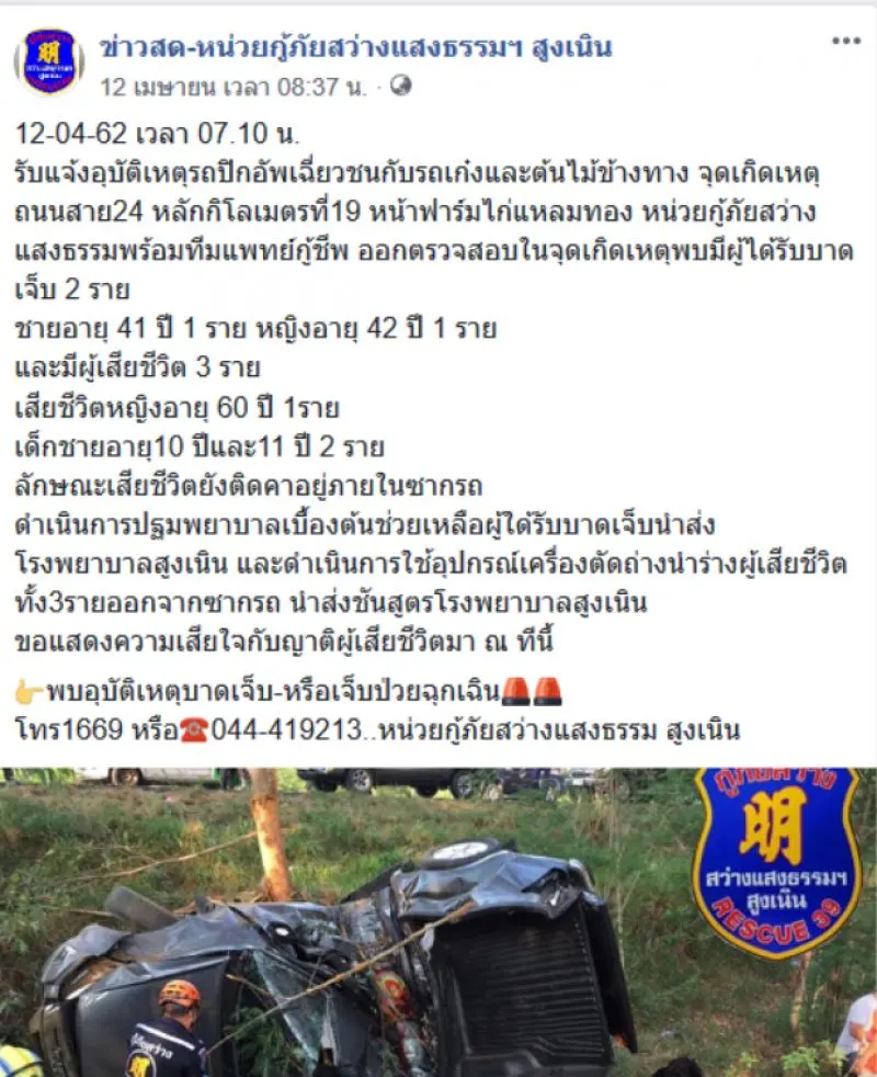รับแจ้งอุบัติเหตุรถปิกอัพเฉี่ยวชนกับรถเก๋งและต้นไม้ข้างทาง จุดเกิดเหตุถนนสาย24 หลักกิโลเมตรที่19 หน้าฟาร์มไก่แหลมทอง หน่วยกู้ภัยสว่างแสงธรรมพร้อมทีมแพทย์กู้ชีพ ออกตรวจสอบในจุดเกิดเหตุพบมีผู้ได้รับบาดเจ็บ 2 ราย ชายอายุ 41 ปี 1 ราย หญิงอายุ 42 ปี 1 ราย และมีผู้เสียชีวิต 3 ราย เสียชีวิตหญิงอายุ 60 ปี 1ราย เด็กชายอายุ10 ปีและ11 ปี 2 ราย ลักษณะเสียชีวิตยังติดคาอยู่ภายในซากรถ ดำเนินการปฐมพยาบาลเบื้องต้นช่วยเหลือผู้ใด้รับบาดเจ็บนำส่ง โรงพยาบาลสูงเนิน และดำเนินการใช้อุปกรณ์เครื่องตัดถ่างนำร่างผู้เสียชีวิตทั้ง3รายออกจากซากรถ นำส่งชันสูตรโรงพยาบาลสูงเนิน ขอแสดงความเสียใจกับญาติผู้เสียชีวิตมา ณ ทีนี้
