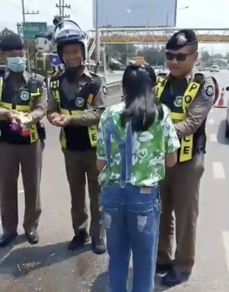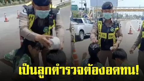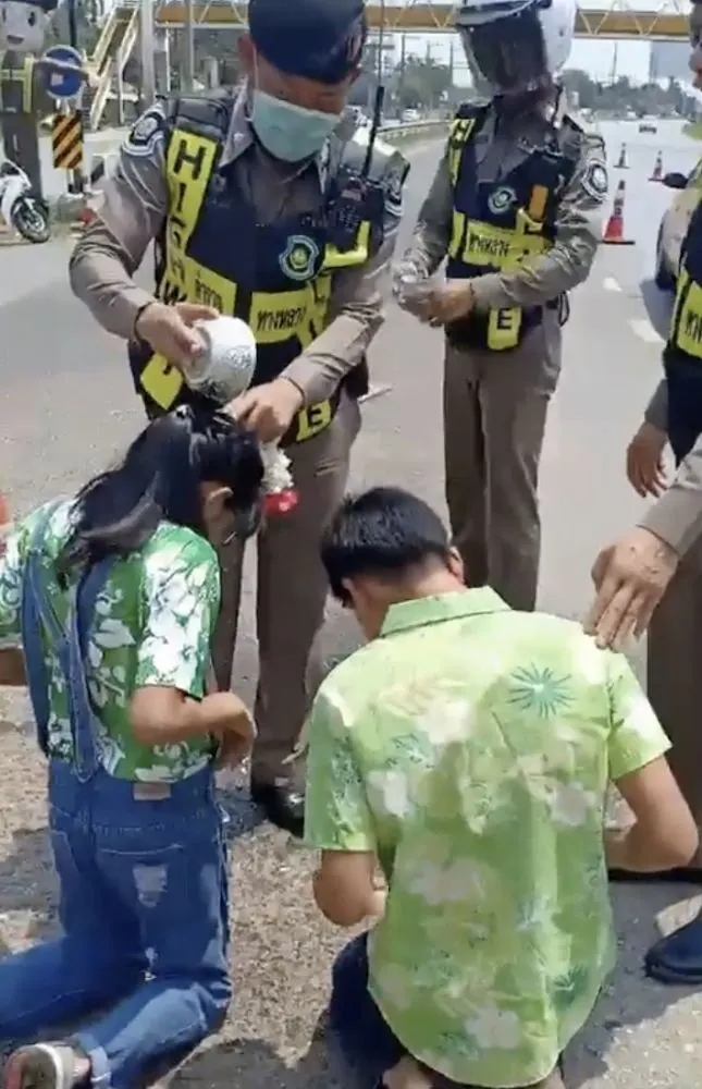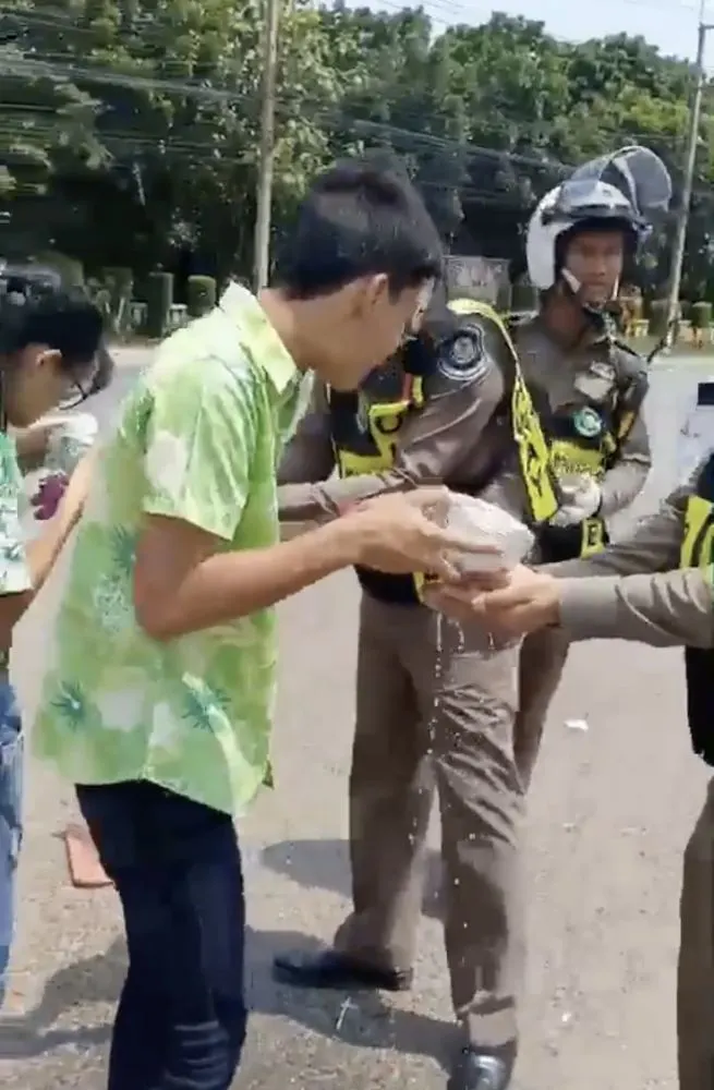 คุณพ่อไม่ได้กลับบ้านคุณแม่จึงพาลูกๆมารดน้ำขอพร ขณะที่กำลังปฏิบัติหน้าที่ข้างถนน