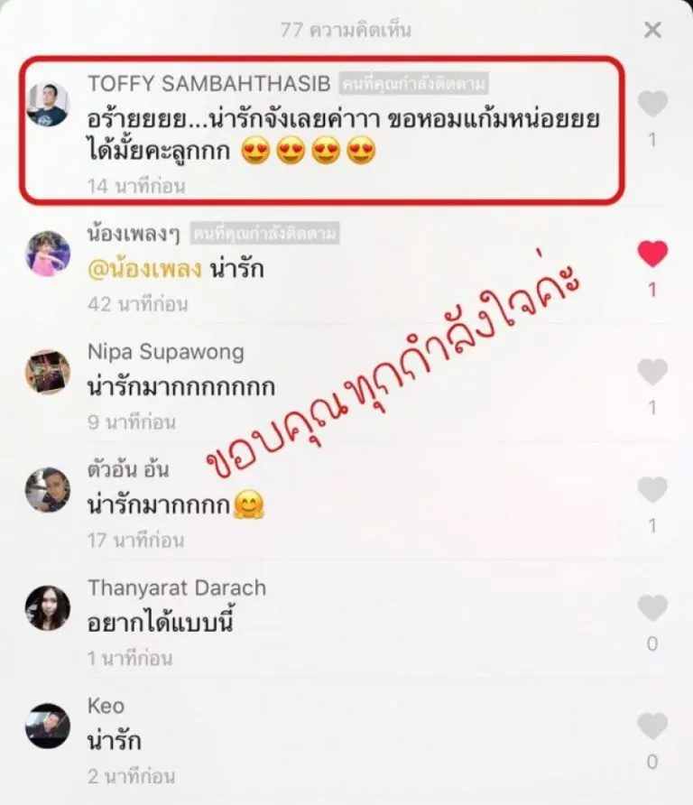 นอกจากนี้ก็ยังมีดาราตลก นักร้องชื่อดังอย่างพี่ท็อฟฟี่ยังมาคอมเม้นท์ โดยได้โพสต์คลิปพร้อมระบุว่า…ตื่นขึ้นมา อ้าว 5 พัน กว่าไลค์ พี่ท๊อฟฟี่ 3บาท50 ก็มาเม้นด้วย 5555 ขอบคุณทุกๆกำลังใจที่กดให้นู๋นะคะ ติดตามน้องเพลงได้ใน tik tok ID : 2143610271 นะคะ