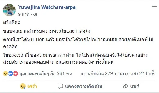 โพสท์ประกาศตามหาน้อง เธียรช์ ก่อนพบว่าน้องได้เสียชีวิต จากอุบัติเหตุที่ไม่คาดคิด