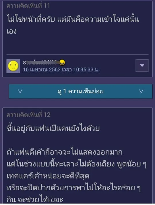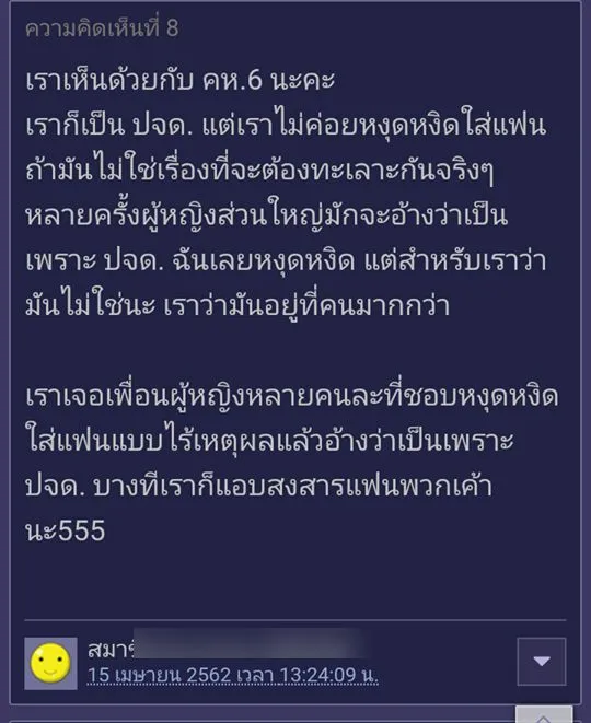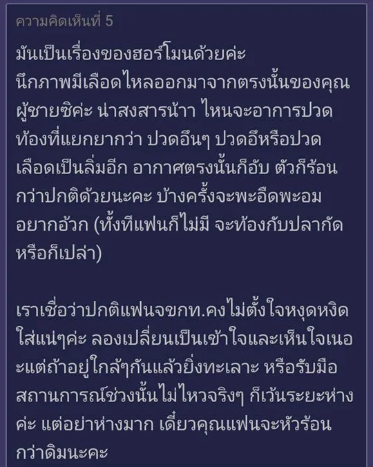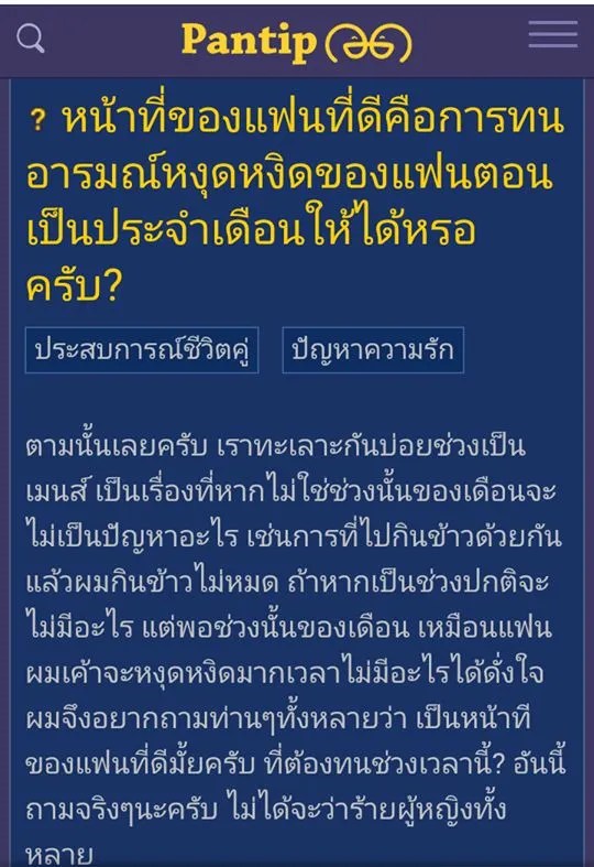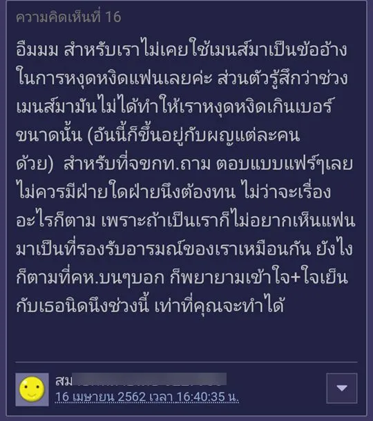 ตามนั้นเลยครับ เราทะเลาะกันบ่อยช่วงเป็นเมนส์ เป็นเรื่องที่หากไม่ใช่ช่วงนั้นของเดือนจะไม่เป็นปัญหาอะไร เช่นการที่ไปกินข้าวด้วยกันแล้วผมกินข้าวไม่หมด ถ้าหากเป็นช่วงปกติจะไม่มีอะไร แต่พอช่วงนั้นของเดือน เหมือนแฟนผมเค้าจะหงุดหงิดมากเวลาไม่มีอะไรได้ดั่งใจ ผมจึงอยากถามท่านๆทั้งหลายว่า เป็นหน้าทีของแฟนที่ดีมั้ยครับ ที่ต้องทนช่วงเวลานี้? อันนี้ถามจริงๆนะครับ ไม่ได้จะว่าร้ายผู้หญิงทั้งหลาย"