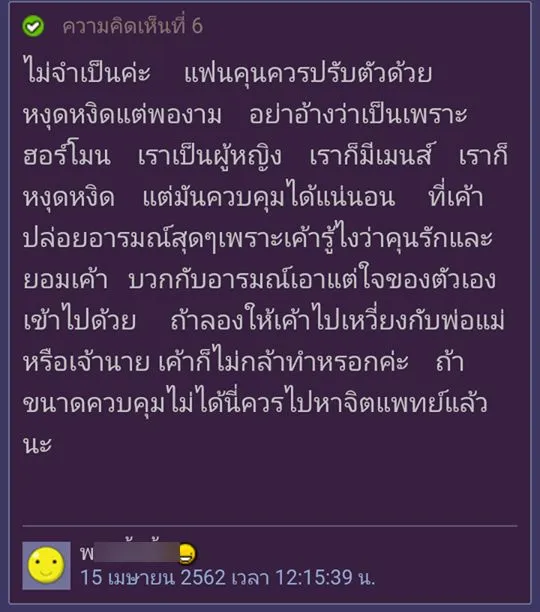 "ไม่จำเป็นค่ะ แฟนคุนควรปรับตัวด้วย หงุดหงิดแต่พองาม อย่าอ้างว่าเป็นเพราะฮอร์โมน เราเป็นผู้หญิง เราก็มีเมนส์ เราก็หงุดหงิด แต่มันควบคุมได้แน่นอน ที่เค้าปล่อยอารมณ์สุดๆเพราะเค้ารู้ไงว่าคุนรักและยอมเค้า บวกกับอารมณ์เอาแต่ใจของตัวเองเข้าไปด้วย ถ้าลองให้เค้าไปเหวี่ยงกับพ่อแม่หรือเจ้านาย เค้าก็ไม่กล้าทำหรอกค่ะ ถ้าขนาดควบคุมไม่ได้นี่ควรไปหาจิตแพทย์แล้วนะ"