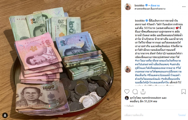 โดย บุ๊คโกะ ได้โพสต์ภาพลงอินสตาแกรมส่วนตัวพร้อมระบุข้อความว่า นี้คือเงินจากการขายน้ำวันสงกรานต์ 4วันคร้า ได้กำไลหลังจากหักทุนแล้วคือ 5035บาท (เลขสวยดีนะคะ) นี้คืออาชีพเสริมตอนเราอยู่กรมทหาร สมัยขายน้ำในตลาดนัด แม่เป็นคนสอนให้ต้มน้ำลำใย น้ำเก๊กฮวย น้ำชาดำเย็น และน้ำต่างๆ เราได้วิชานั้นมาจากแม่ แม่ไม่เคยสอนให้เราอายทำกิน และหมิ่นเงินน้อย 4วันที่ผ่านมาได้รำลึกความหลังครั้งเก่าๆตอนที่ลำบากมากๆ มันทำให้เรารู้ว่าแม่สอนให้เราเข้มเเข็งและเอาชนะอุปสรรคต่างๆมาได้