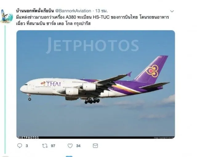 ด่วน เครื่องการบินไทยถูกรถขนอาหารสนามบินเฉี่ยวปีกที่ปารีส มีนักปั้นมือทอง เอ ศุภชัย ร่วมไฟต์ด้วย