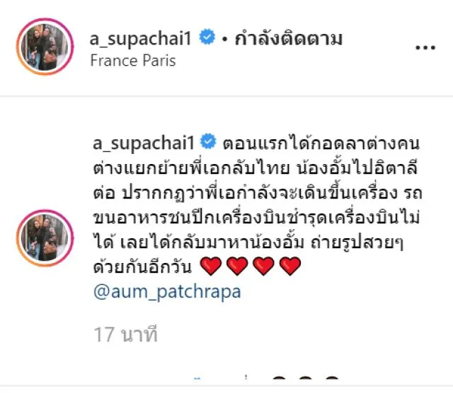 ล่าสุด เอ ศุภชัย ผู้จัดการส่วนตัวได้โพสต์ภาพอธิบายเรื่องที่เกิดขึ้นว่า.. ตอนแรกได้กอดลาต่างคนต่างแยกย้ายพี่เอกลับไทย น้องอั้มไปอิตาลีต่อ ปรากกฏว่าพี่เอกำลังจะเดินขึ้นเครื่อง รถขนอาหารชนปีกเครื่องบินชำรุดเครื่องบินไม่ได้ เลยได้กลับมาหาน้องอั้ม ถ่ายรูปสวยๆด้วยกันอีกวัน
