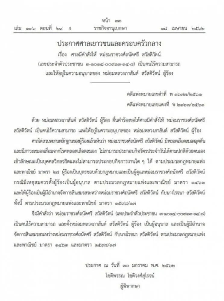 วันที่ 18 เมษายน 2562 ผู้สื่อข่าวรายงานว่า เว็บไซต์ราชกิจจานุเบกษา ได้เผยแพร่ประกาศ ศาลเยาวชนและครอบครัวกลาง เรื่อง ศาลมีคําสั่งให้ หม่อมราชวงศ์ถนัดศรี สวัสดิวัตน์ เป็นคนไร้ความสามารถ และให้อยู่ในความอนุบาลของ หม่อมหลวงภาสันต์ สวัสดิวัตน์ ผู้ร้องระบุว่า