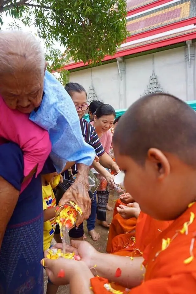 "ให้ภาพเหล่านี้เล่าเรื่อง ความประทับใจในวันนี้ (17 เมษายน 62) ณ วัดชุมแสง จังหวัดระยอง นี่คือความรักระหว่าง 2 ท่านนี้ ที่ถึงแม้คุณยายจะไม่ค่อยแข็งแรง แต่ลูกสาวก็ให้คุณยายขี่หลังมาทำบุญ รดน้ำดำหัวผู้ใหญ่ และสรงน้ำพระ ซึ่งเป็นภาพที่ปลื้มใจและอบอุ่นมากสำหรับผู้พบเห็นในวัดวันนี้ จึงอยากแชร์ให้ทุกคนเห็น ขออนุญาตบุคคลในภาพด้วยนะคะ Cr. ภาพสวยๆจากอาจารย์ Oranuch Saetung"