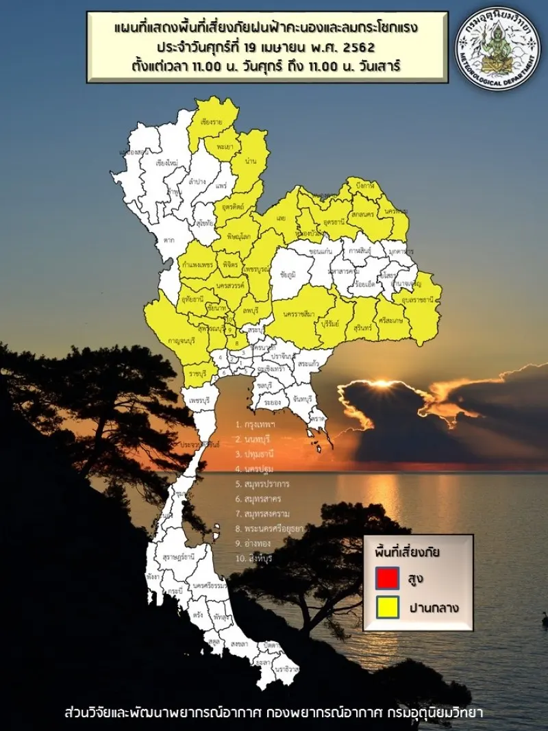 เว็บไซต์กรมอุตุนิยมวิทยาประกาศพื้นที่สีเหลือง เสี่ยงภัยฝนฟ้าคะนองประจำวันที่ 19 เมษายน 2562
