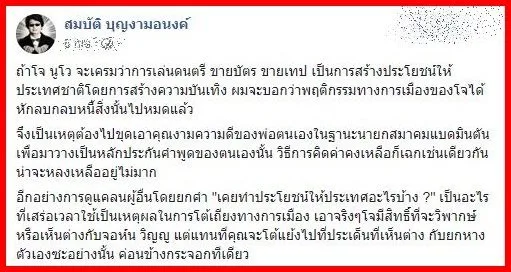“พ่อมันนี่เอง เคยทำประโยชน์เ...้ยอะไรให้กับประเทศชาติบ้าง มึงตอบมาเลย พ่อกูเคยรับใช้ชาติ แบดมินตันไทยไประดับโลก ทำงานเสียภาษีจน Retired กูเองก็สร้างความบันเทิงทั้งดนตรี การแสดง และกีฬา ที่สำคัญรักชาติ ศาสตร์ กษัตรย์ ไม่ส่งเสริมคนเลว นายมึงหนีไปกี่ตัวแล้ว อ่ะ คดีรถดับเพลิง อ่ะ รวยแล้วยังเสือโกงอย่างนั้นคนดีเหรอ กูนี่แหละออกตัวทางการเมืองเปิดหน้าชก แบบตรงๆ ไม่ต้องกวนตีน แบบมึง”