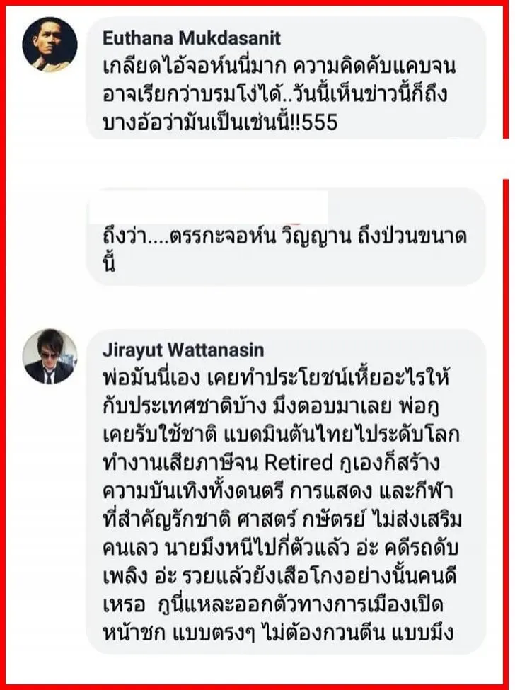 จากกรณี นายจิรายุส วรรธนะสิน หรือ โจ นูโว ศิลปิน-นักแสดง ได้เข้าไปตอบใต้โพสต์ของนายยุทธนา มุกดาสนิท ผู้กำกับภาพยนตร์ และนักเขียน ที่ได้แชร์ข่าวของจอห์น วิญญูไว้หน้าเฟซบุ๊ก ความว่า