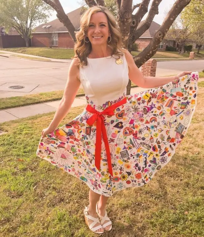 14 “ แม่ของฉันเป็นครูสอนศิลปะที่น่ารักที่สุดเท่าที่เคยมีมา !! เธอแต่งตัวด้วยชุดขาวและให้นักเรียนทุกคนวาดสิ่งหนึ่งบนชุดของเธอ นี่คือเธอในงานแสดงศิลปะของนักเรียน”