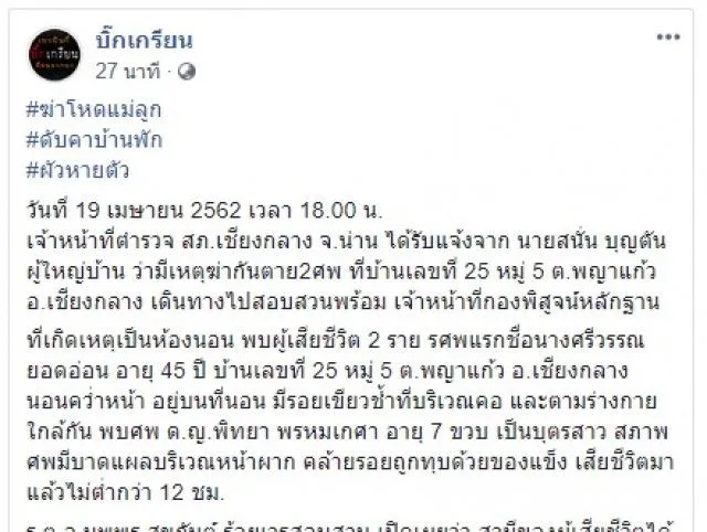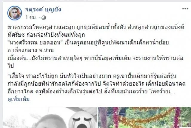 จากกรณี มีผู้ใช้เฟสบุ๊คชื่อ จตุรงค์ บุญยัง ได้ออกมาโพสต์ภาพ พร้อมทั้งได้ระบุข้อความว่า... ฆาตรกรรมโหดครูสาวและลูก ถูกทุบตีบอบช้ำทั้งตัว ส่วนลูกสาวถูกของแข็งตีที่ศีรษะ ก่อนจ่อหัวยิงทั้งแม่ทั้งลูก "นางศรีวรรณ ยอดออน" เป็นครูสอนอยู่ที่ศูนย์พัฒนาเด็กเล็กผาน้ำย้อย อ.เชียงกลาง จ.น่าน