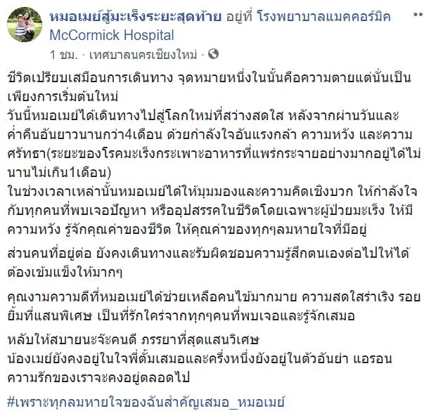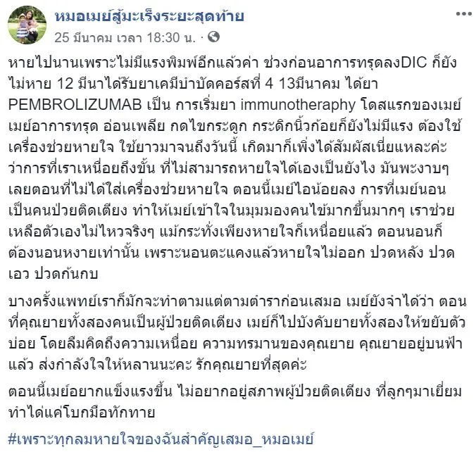 เป็นคนที่ชอบดูแลคนอื่นเสมอถึงแม้วันนี้เธอจะดีขึ้นแต่สิ่งที่ต้องทำคือทำให้คนไข้ในการดูแลของเธอหายนั้นคือสิ่งที่เธอต้องการเลยตอนที่เธอเป็นนั้นคือตอนที่เธอกำลังมีน้องได้ 36 สัปดาห์ เราคิดว่าอาจเป็นตอนนั้นเลยแต่ไม่ได้ตัดชิ้นเนื้อไปตรวจ เวลาจึงล่วงเลยต่อมาเมย์อยากจะเลี้ยงลูกด้วยนมแม่ช่วงนั้นร่างกายก็เริ่มมีสัณญาณบอกถึงความล้า เรี่ยวแรงน้อยลง ต้องกินกาแฟทุกวันเพื่อให้มีแรง แต่ก็ไม่ได้คิดถึงเรื่องไม่สบายเลย