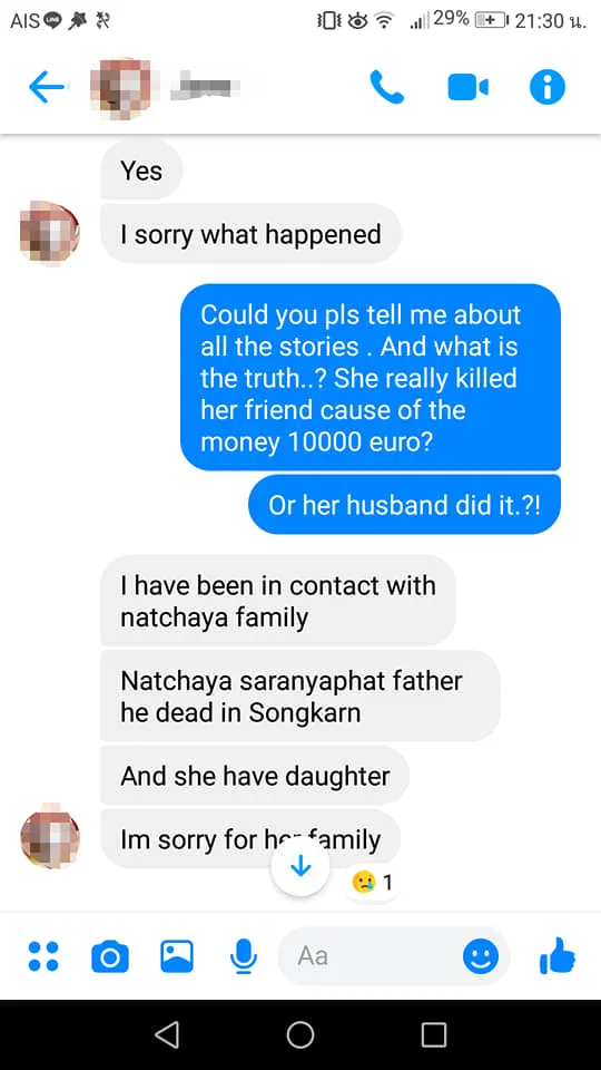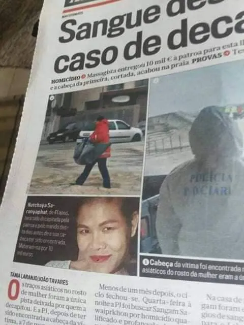 ข่าวหน้าหนึ่ง ในประเทศโปรตุเกสรายงานว่า ฆาตกร ตามบัญชีเฟซบุ๊ค หมอนวดสาวไทยคนหนึ่ง ได้ฆ่าผู้ตายซึ่งใช้ชื่อตามเฟซบุ๊คว่า “Natchaya Saranyaphat” เพื่อนร่วมงาน เพราะทะเลาะกันเรื่องเงินจำนวน 10,000 ยูโร ที่นำมาลงทุนทำร้านนวด (ตามคำให้การรับสารภาพกับตำรวจ) ผู้ตายเสียชีวิตเมื่อวันที่ 7 มีค.62 พบชิ้นส่วนเฉพาะส่วนศีรษะที่ชายหาด ที่เหลือยังไม่พบ